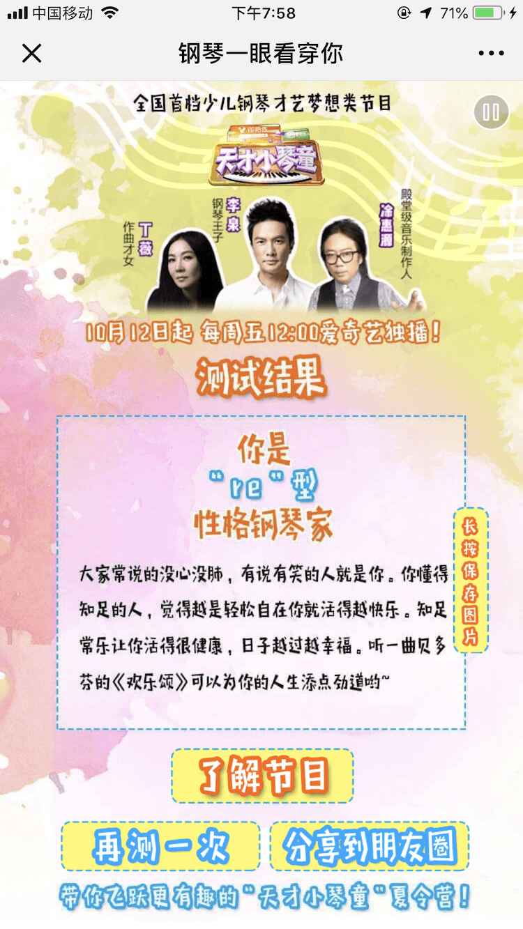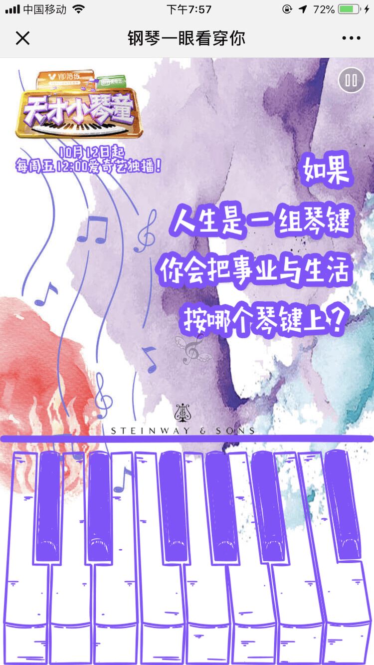 《天才小琴童》据不完全统计,中国有三千多万弹钢琴的孩子,但是“琴童”并不能与“爱音乐”划等号。有的琴童可能会说,是父母的“逼迫”才走上学琴的道路,有的可能仅仅是为了多个一技之长,好给之后的升学备个“资本”。但是一个真正热爱音乐的人,唯有把音乐当成生活中不可或缺的东西时,才可能在这个领域有所作为,并最终完成心之所愿。由VIP陪练独家冠名播出的全国首档少儿才艺梦想类节目《天才小琴童》正是基于这个目的应运而生。