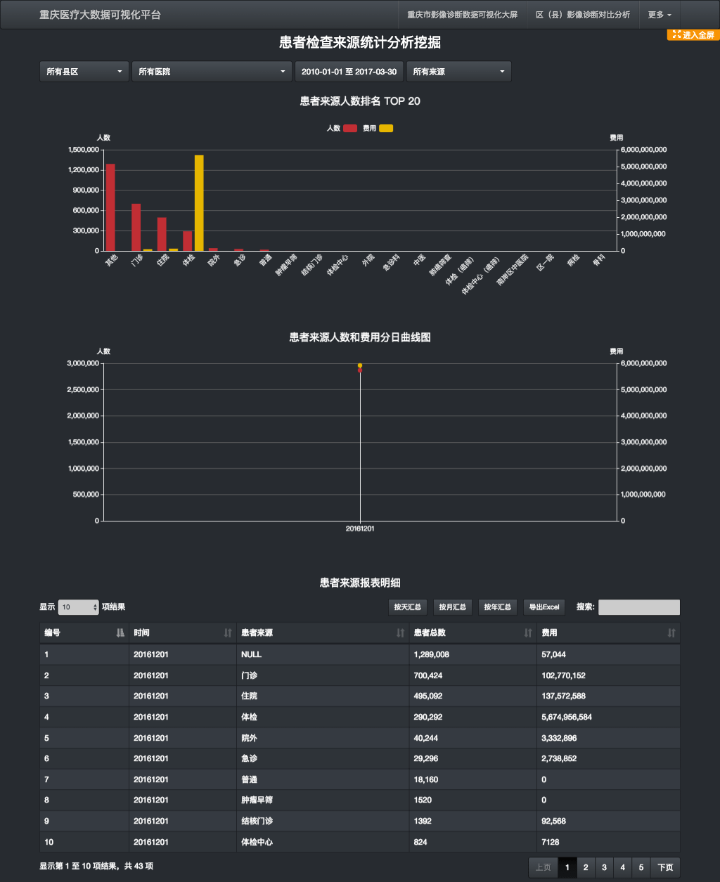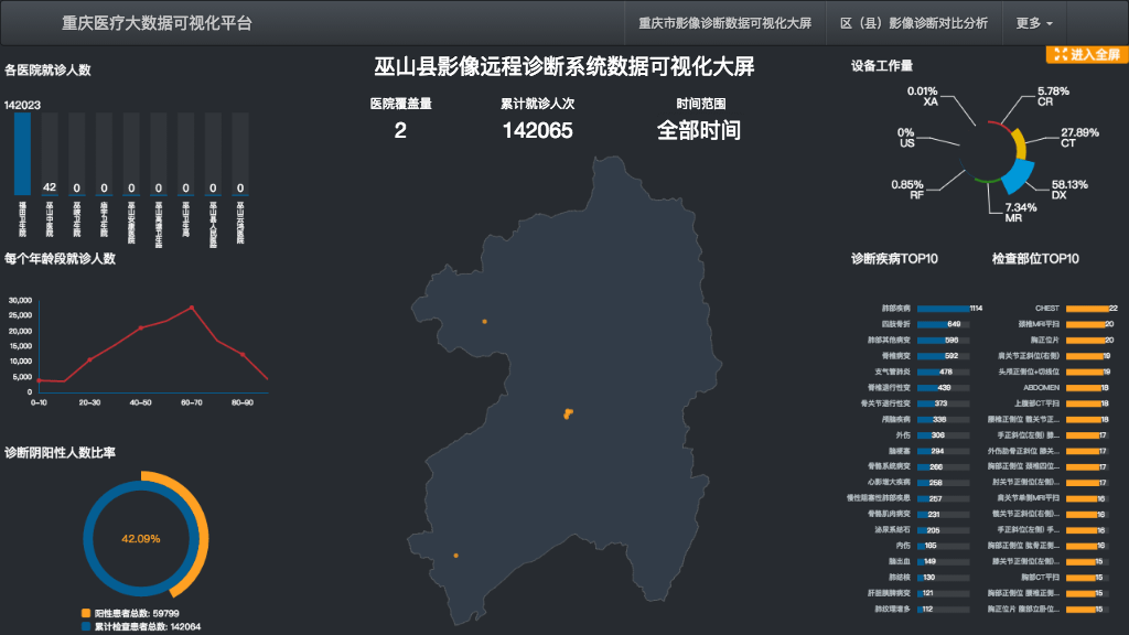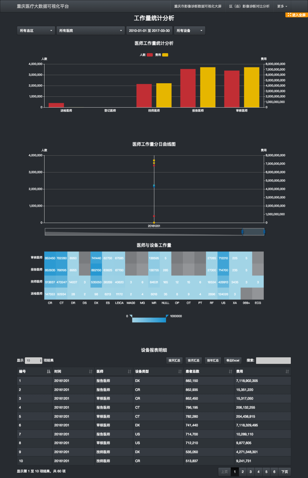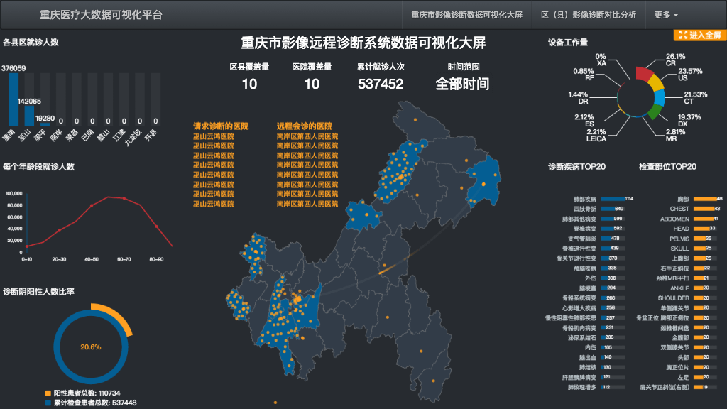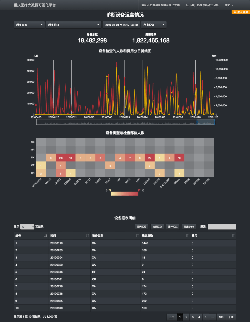 本系统是以影像远程诊断系统(PACS系统数据为基础)的业务数据为核心的大数据分析与决策支持可视化系统,它可以对区域、医院内运行设备的状况进行检测与可视化展示。