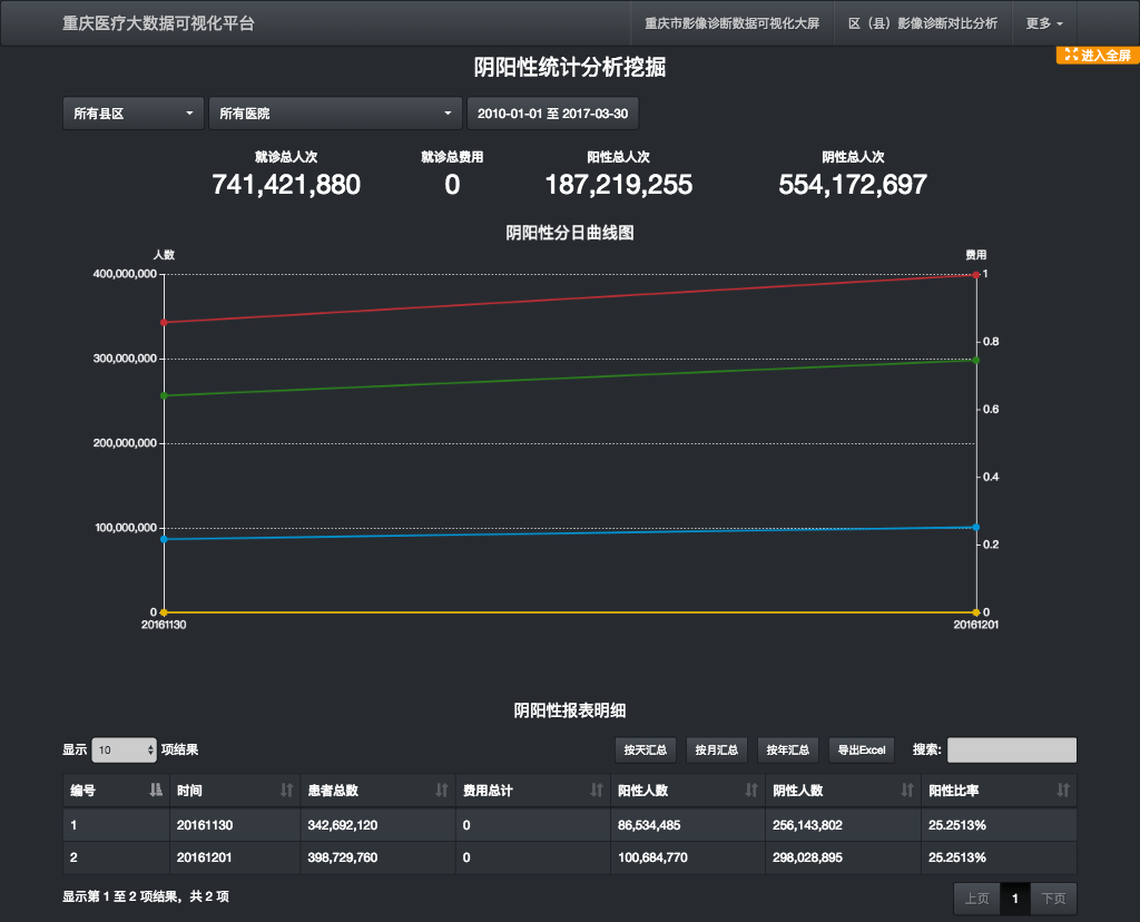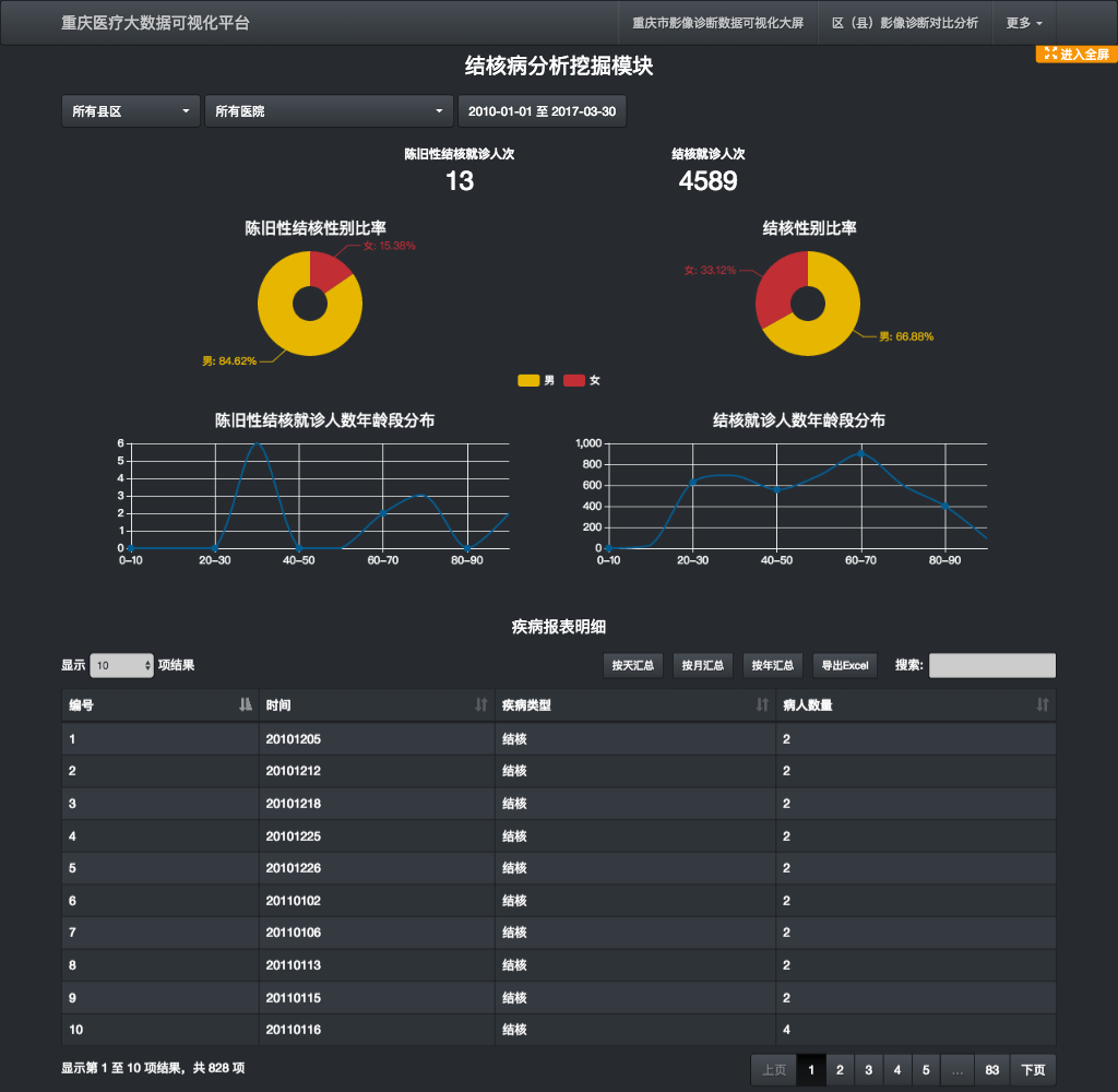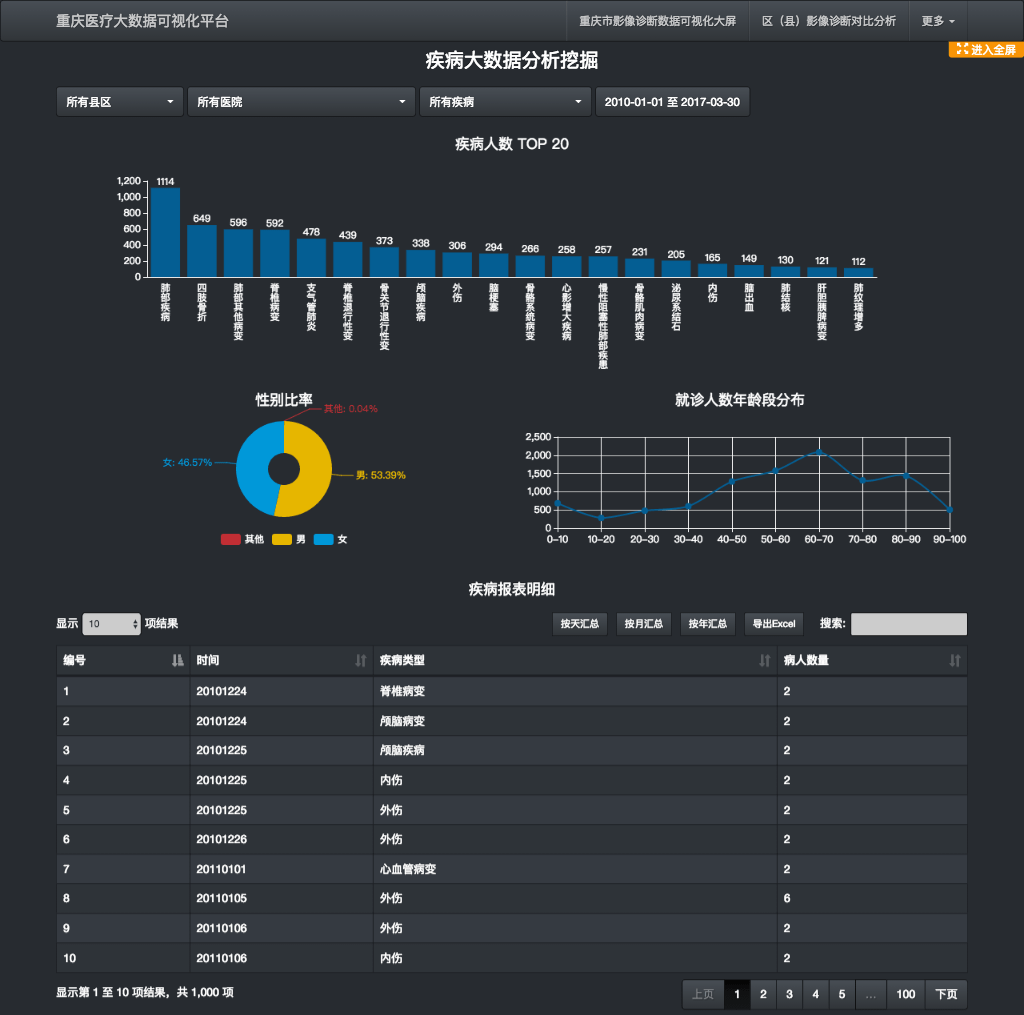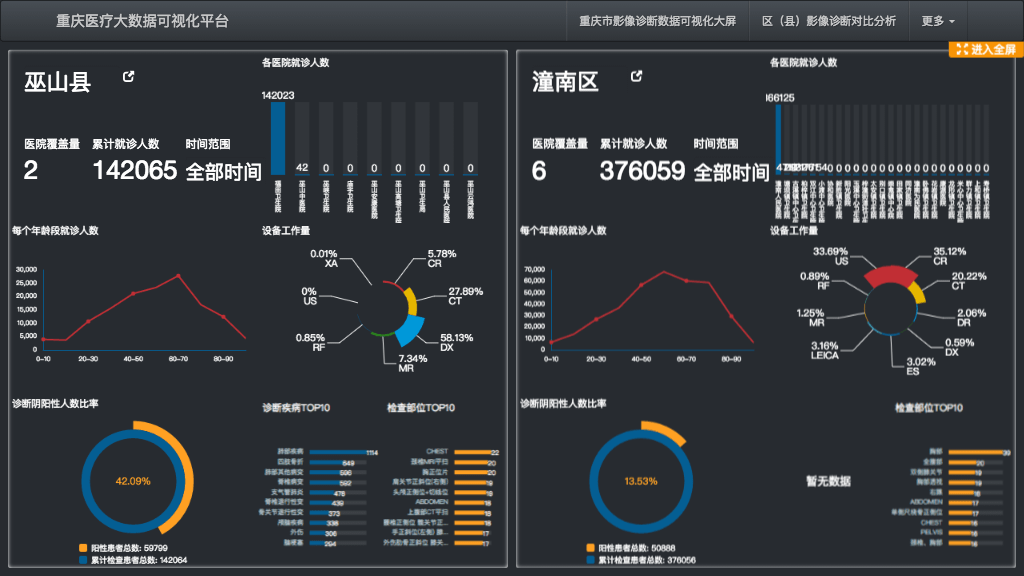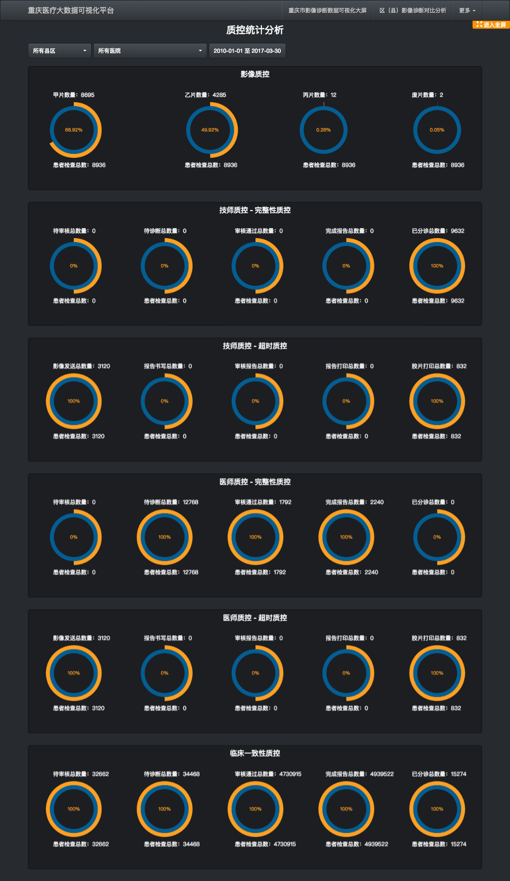 本系统是以影像远程诊断系统(PACS系统数据为基础)的业务数据为核心的大数据分析与决策支持可视化系统,它可以对区域、医院内运行设备的状况进行检测与可视化展示。